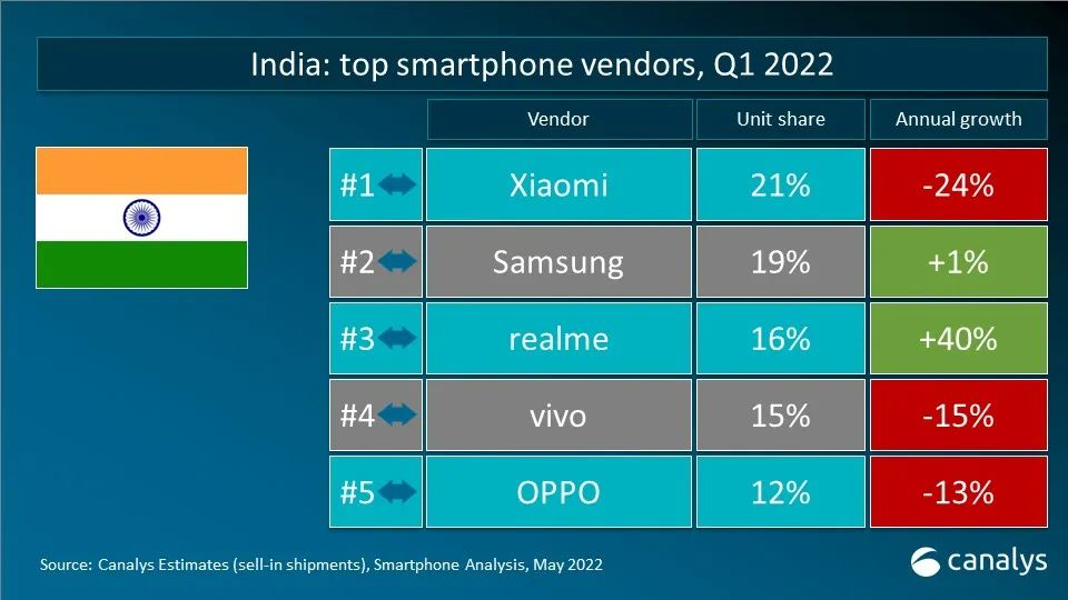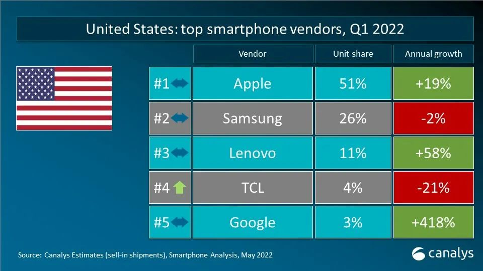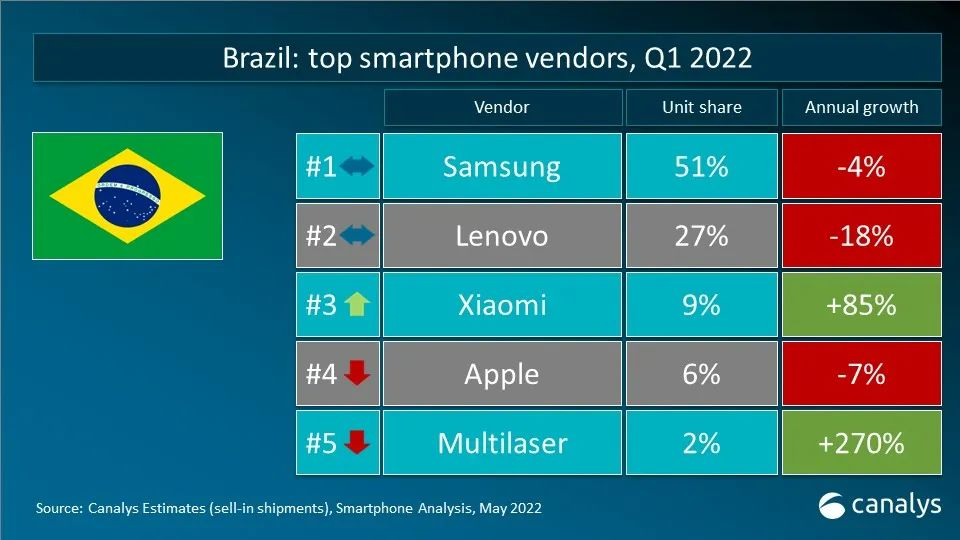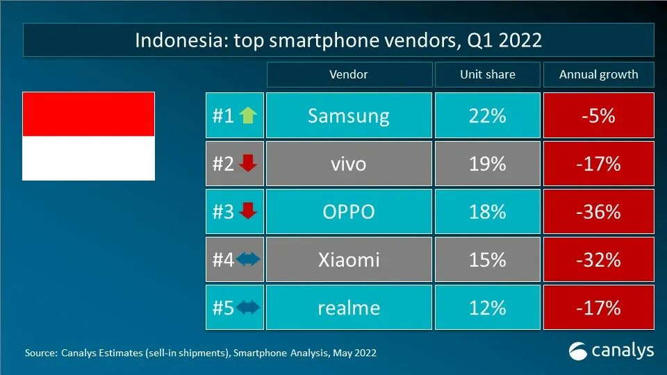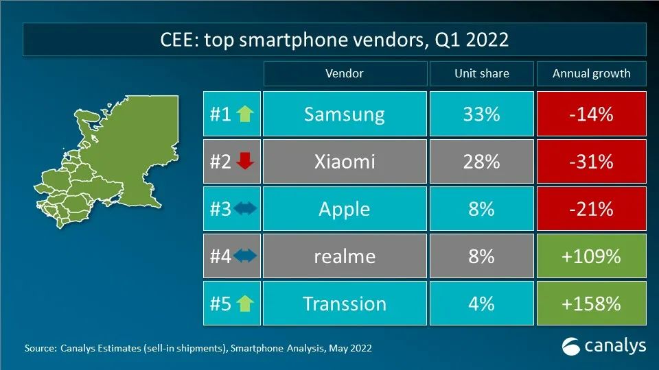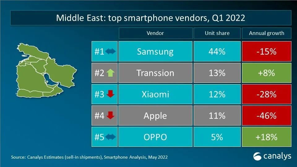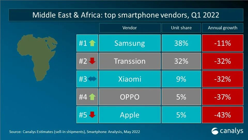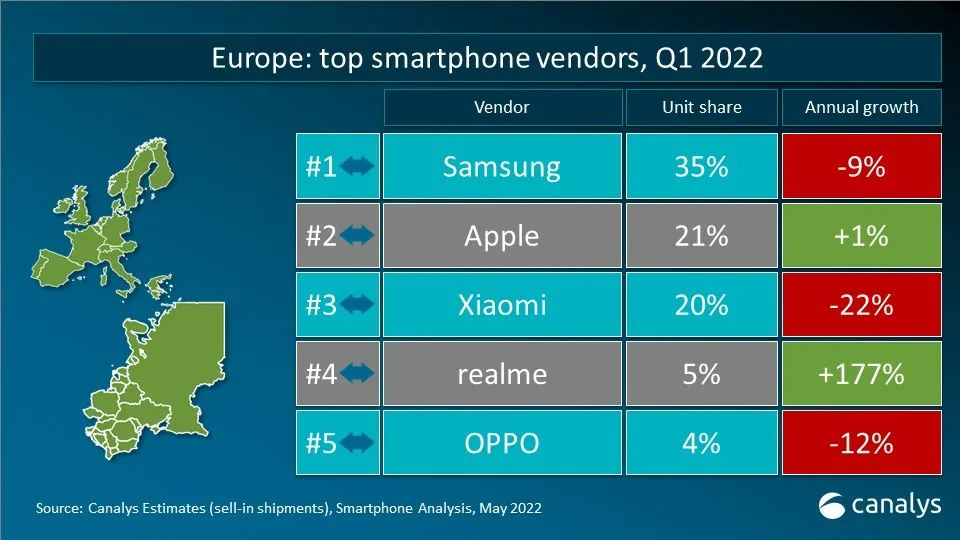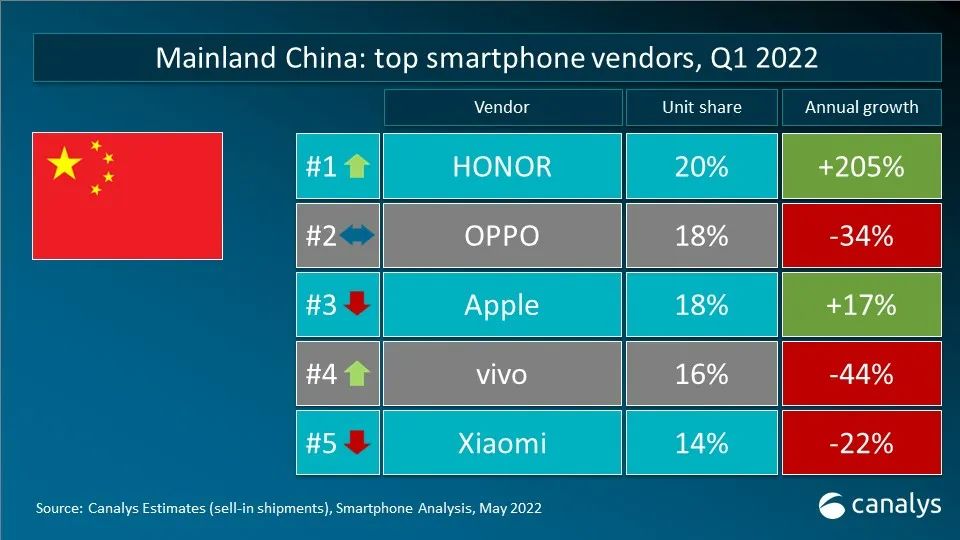 依据 Canalys 发布的最新数据,2022 年第一季度,全球智能手机出货量到达 3.112 亿台,同比下降 11%。三星在更新 2022 年产品组合后重夺桂冠,出货量到达 7370 万台,仍较一年前下降 4%。苹果凭借着商场对 iPhone 13 系列的旺盛需求以及全新 iPhone SE 机型的问世,斩获 8% 的稳健增加,出货量到达 5650 万台。小米、OPPO 和 vivo 跻身前五。